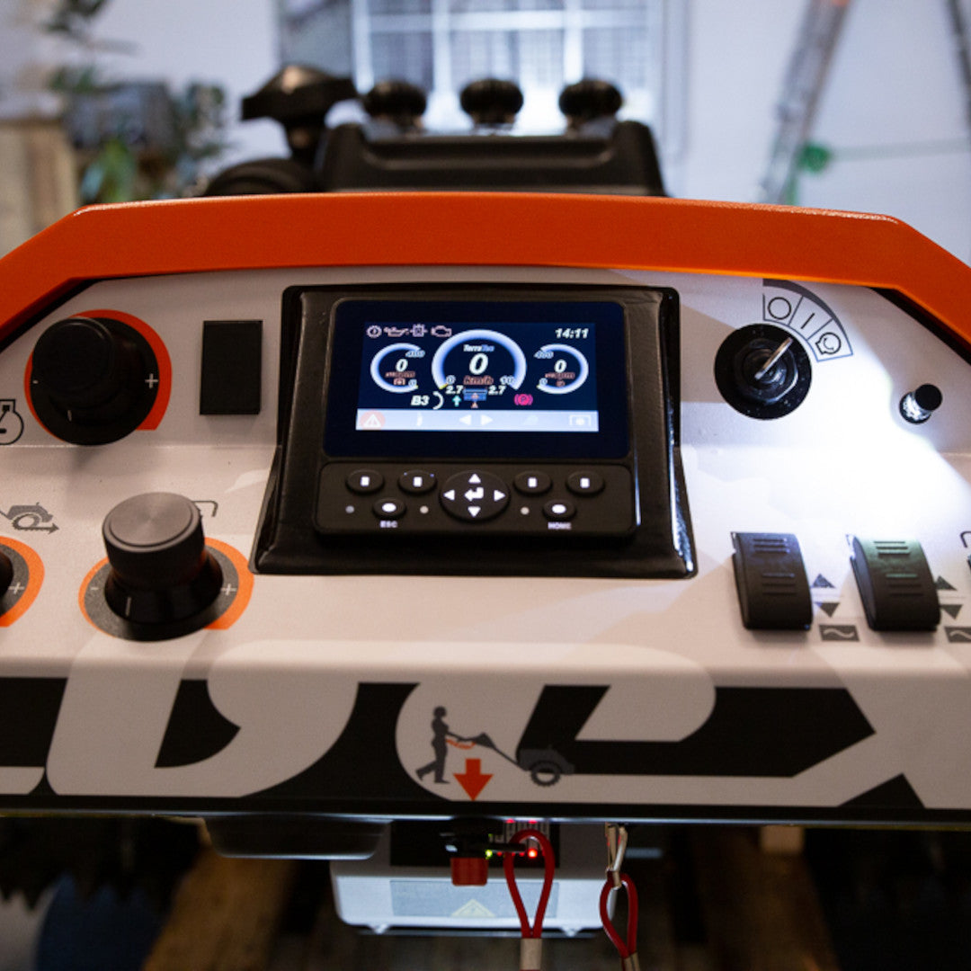 Pour un appareil aussi évolué que le porte-outils IBEX G4, il fallait bien entendu un poste de conduite à la hauteur des technologies disponibles sur l'appareil. Ainsi, le fabricant autrichien TerraTec a équipé sa cellule d'un écran convivial au guidon, affichant toutes les informations de l'appareil telles que les vitesses, températures, vitesses de rotation de la machine. Il est aussi possible d'y afficher les performances totales ou journalières de l'IBEX G4 et de prérégler la combinaison de la cellule avec 99 accessoires différentes. Solide et étanche, l'écran installé sur la motofaucheuse G4 IBEX répond aux exigences de résistance que demande les travaux difficiles en extérieur et la luminosité réglable de l'appareil couplé à ses grands boutons facilement manipulables apporteront un grand confort et une réelle facilité d'utilisation à l'opérateur.