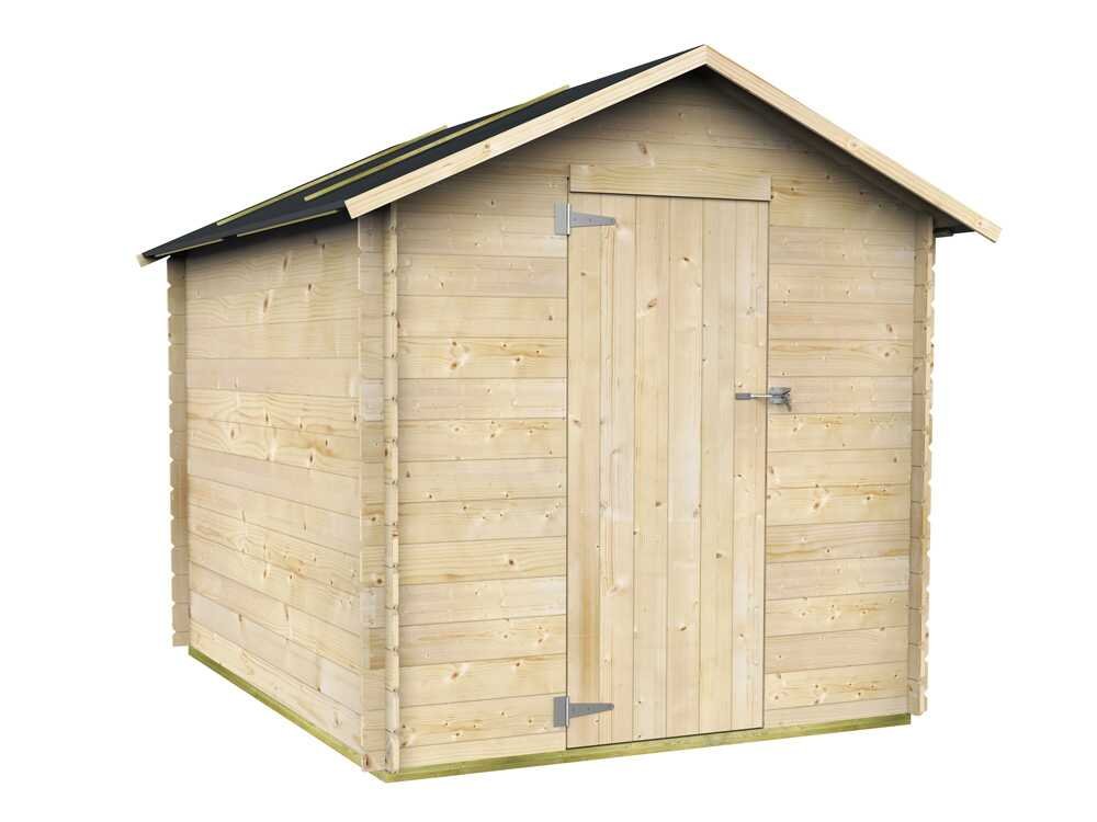 L’intérieur, d’une superficie de 3,3 m², peut être facilement aménagé et permet de ranger des objets de différentes tailles. Le toit à deux versants, également en sapin, lui confère un aspect traditionnel et protège efficacement de la pluie et des intempéries.