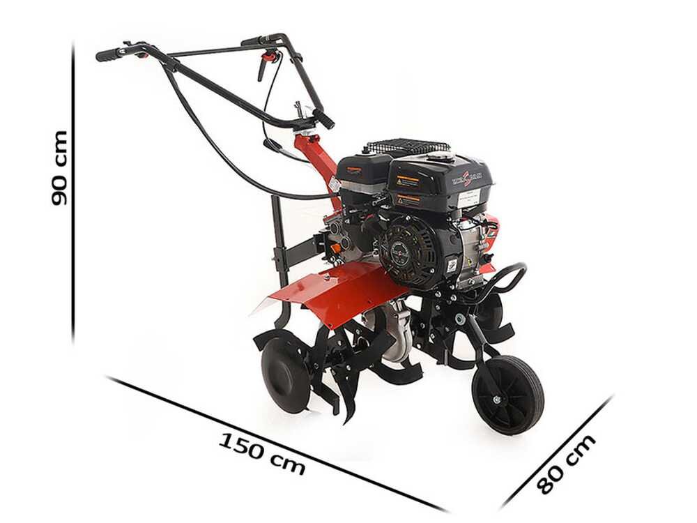 Il s’agit d’une motobineuse de type semi-professionnel avec moteur thermique à essence, de dimensions moyennes, exceptionnellement efficace pour des travaux agricoles de moyenne-basse difficulté et dans la culture de surfaces moyennes.