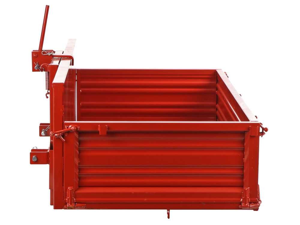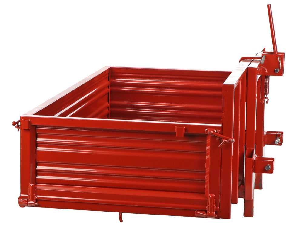 Cette benne pour tracteur est équipée d’un levier à basculement rapide.