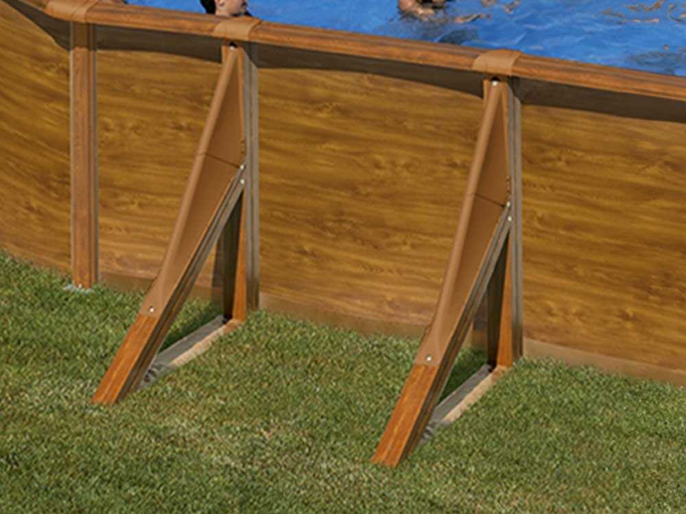 La piscine Gre Pacific Oval 610 x 375 cm a une structure renforcée par des poteaux latéraux pour assurer une plus grande stabilité et, pour plus de sécurité, des protections par injection sont incluses pour les joints entre les profils horizontaux, assurant une connexion sûre.
