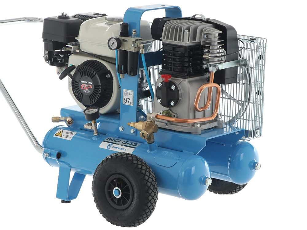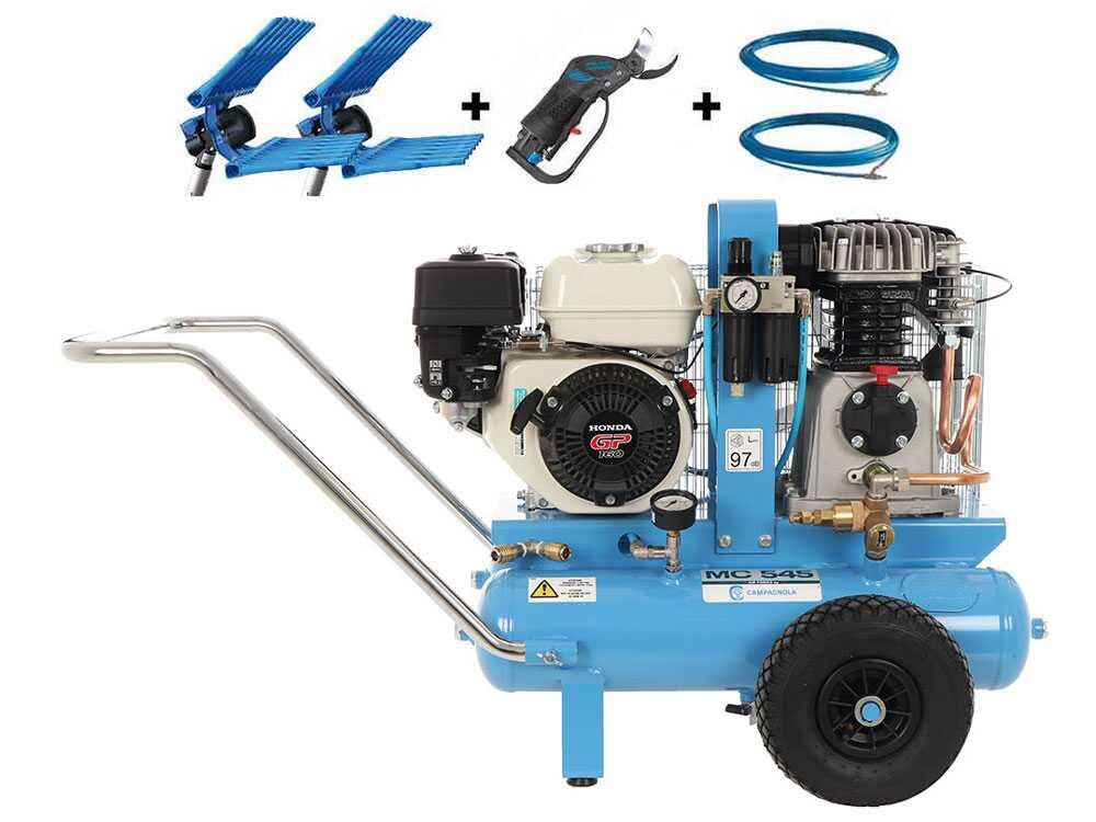 Le motocompresseur Campagnola MC 545 est un compresseur à moteur thermique conçu pour alimenter et faire fonctionner des outils pneumatiques pour la taille et la récolte dans le secteur agricole.