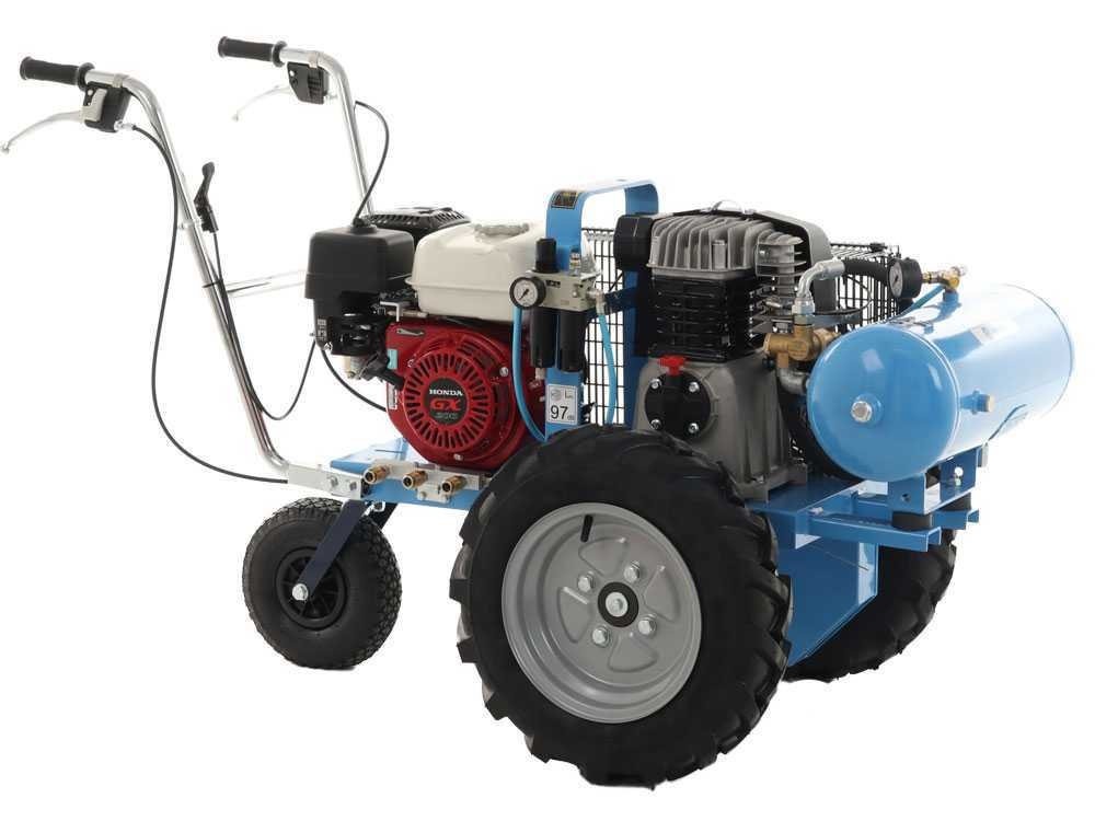 Ce moto-compresseur vous permet d’utiliser vos outils pneumatiques éloignés des sources d’alimentation par exemple dans les champs et de la déplacer avec facilité grâce à sa traction.