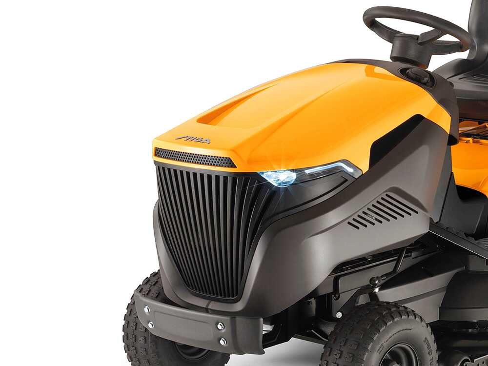 Le tracteur tondeuse Stiga Estate 7102 W est équipé d’un écran LED pour le suivi des indicateurs de fonctionnement, notamment l’état de la batterie et de la transmission. Les phares à LED assurent une excellente visibilité même en conditions de faible luminosité.